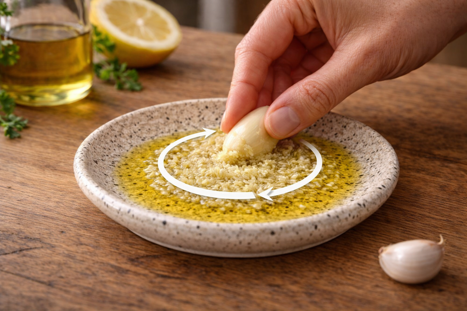 Knoblauchzehe kreisend über die Reibefläche bewegen, bis eine feine Paste entsteht.